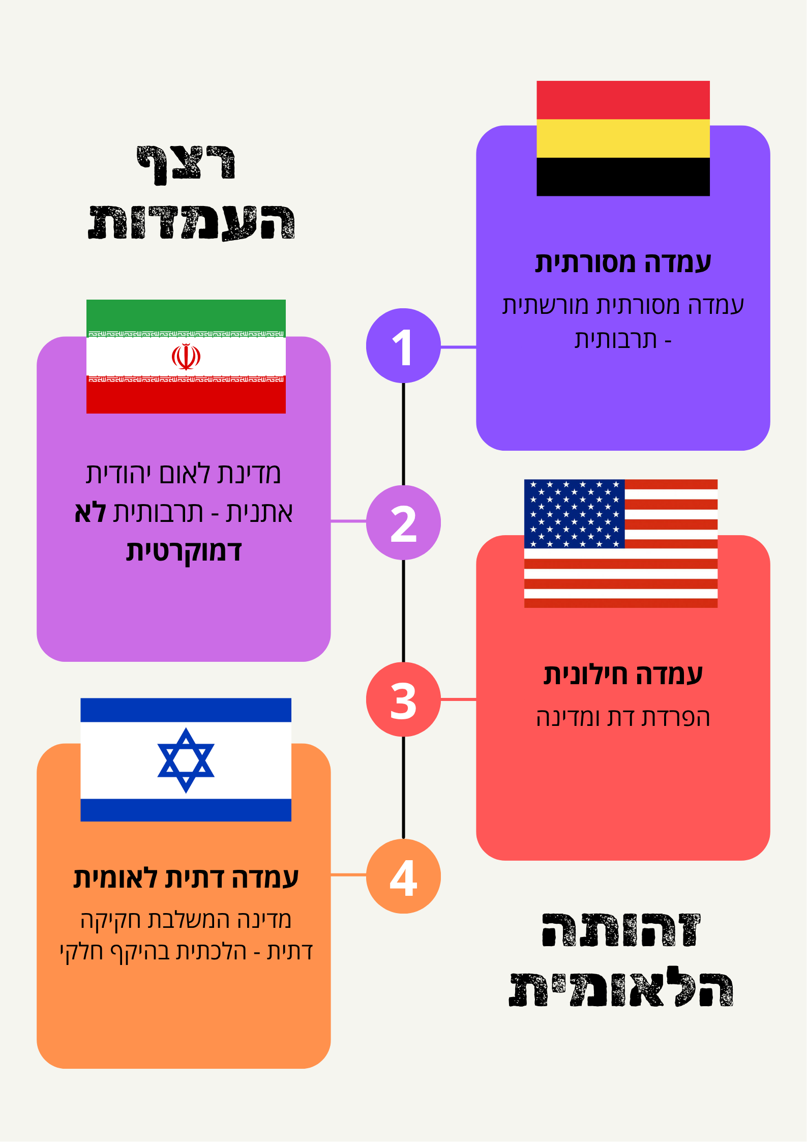 | מדינת לאום יהודית אתנית-תרבותית לא דמוקרטית | מחויבות לשמירה וחיזוק אופיה היהודי של המדינה גם במחיר פגיעה בשוויון זכויות של לא-יהודים | הסמלים, החוקים והמרחב הציבורי ניתנים ביטוי לאופי והזהות היהודית במדינה. | במדינה זו מתקיים חוק השבות כלשונו וניתן לראות בו חוק מפלה. |